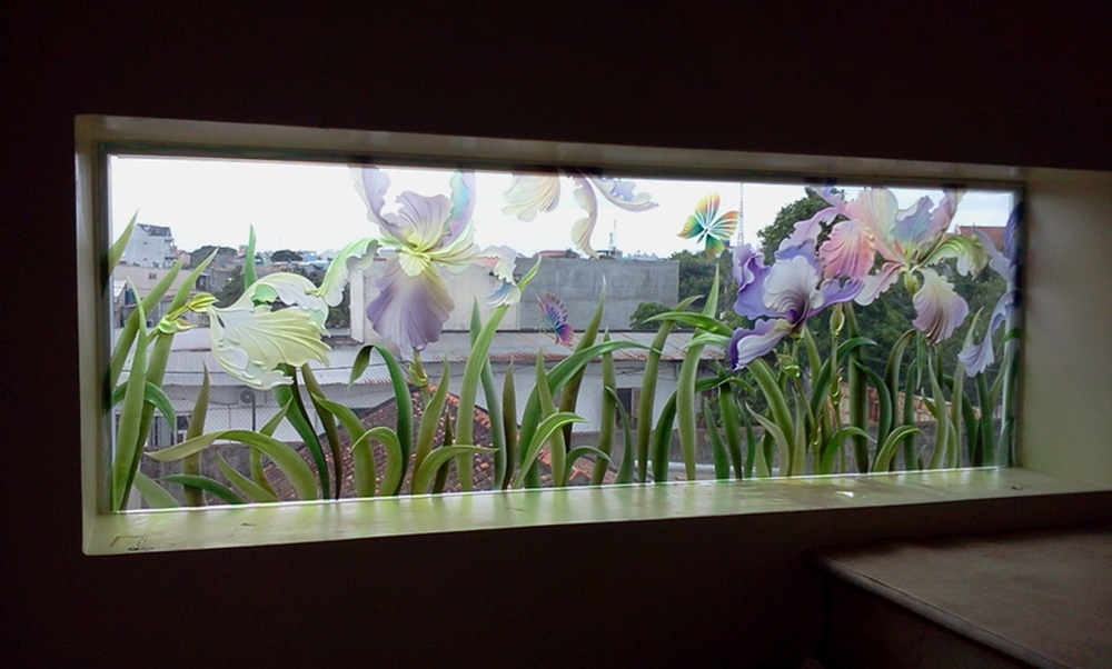 Là loại tranh kính sau khi được tạo hình chi tiết các lớp để tạo nên hiệu ứng 3D, sẽ được vệ sinh sạch sẽ bề mặt, sau đó đóng gói và chuyển lên công trình để lắp đặt. Sự trong suốt, màu trắng góp phâng tôn vinh nét đẹp tinh khôi, phóng khoáng