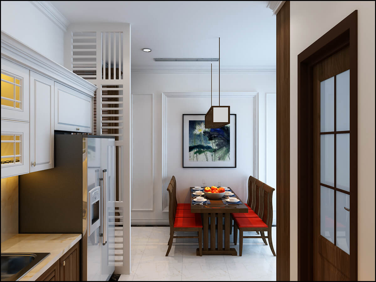Về tổng quan phong cách thiết kế, chủ nhà là người đã có tuổi, thích sự ấm cúng, gần gũi, mộc mạc và chín chắn. Chúng tôi lựa chọn tông màu chủ đạo là màu trắng kết hợp màu nội thất gỗ nâu trầm cùng ánh sáng vàng trang trí. Tầng một của căn biệt thự liền kề được bố trí phòng khách phía ngoài đến cầu thang và phòng bếp, bàn ăn ở phía trong. Chúng tôi đặc biệt chú ý đến các họa tiết nội thất giúp thể hiện sự cổ điển, lịch sự của chủ nhà bằng thiết kế cửa gỗ, Cột gỗ có hoa văn truyền thống.