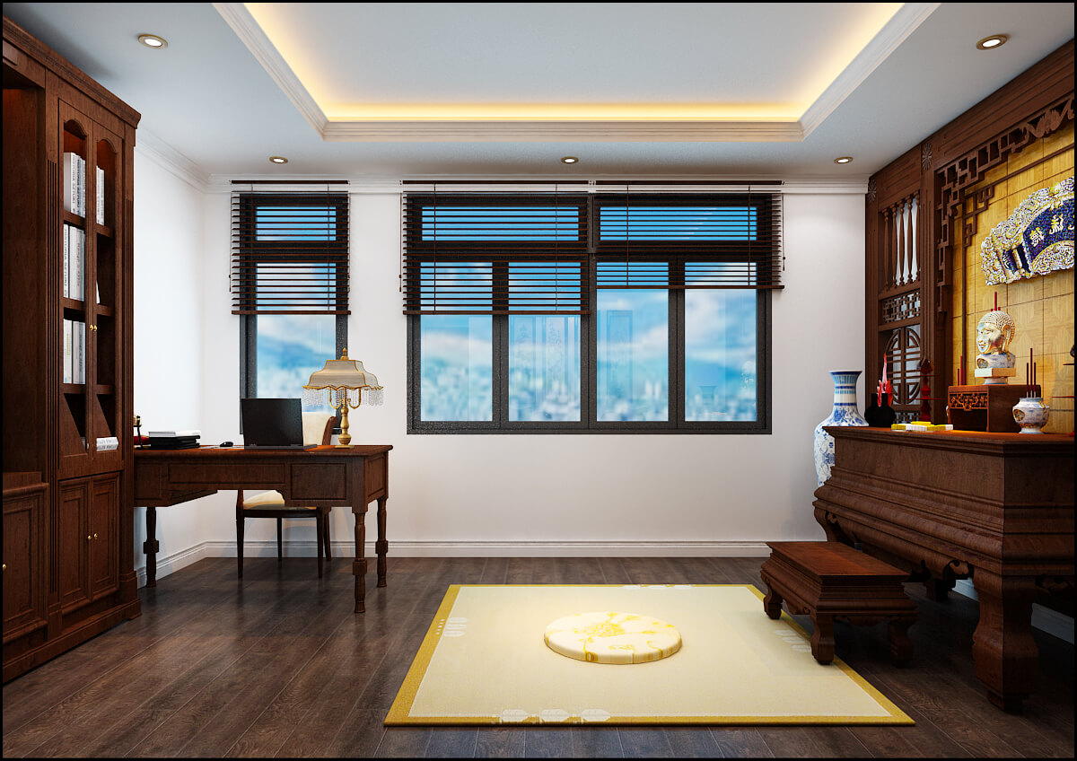 Theo yêu cầu của chủ nhà, phòng thờ được kết hợp với thư viện và bàn làm việc. Chúng tôi mang phong cách thiết kế Á Đông truyền thống vào căn phòng này vừa tạo sự trang nghiêm vừa hỗ trợ cho người làm việc luôn giữ được sự minh mẫn, tập trung.