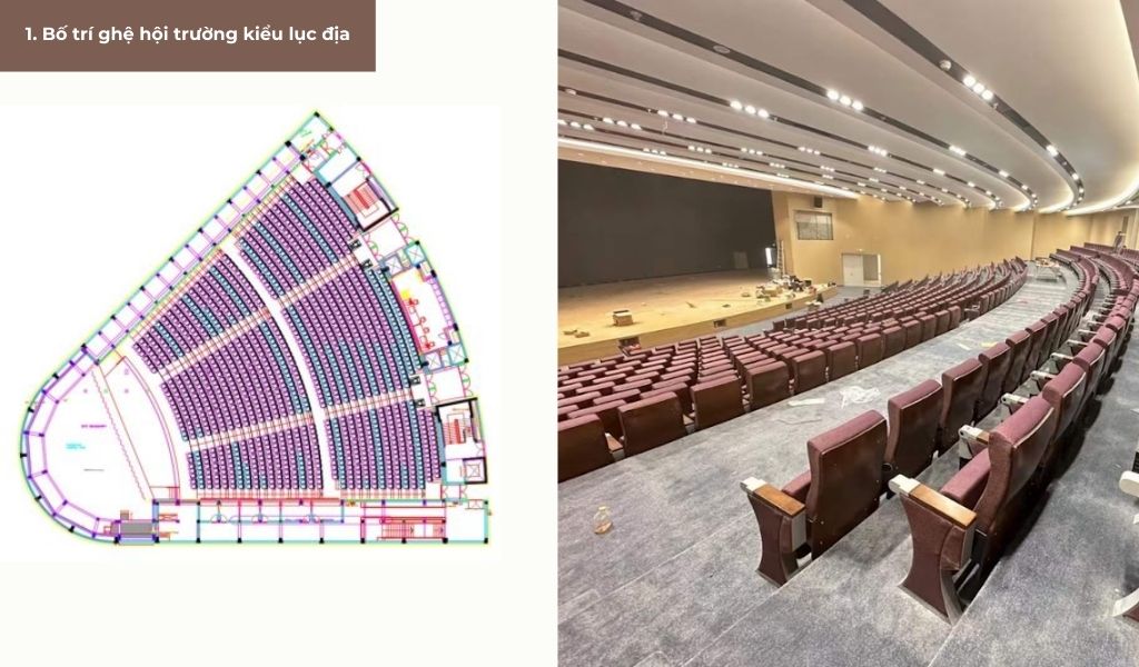 Hình quạt + sàn có độ dốc: tối ưu tầm nhìn, trải nghiệm “đã” nhất cho đa mục đích.