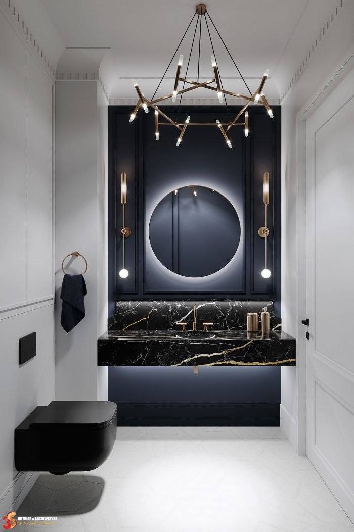 Kệ phòng tắm được làm bằng đá cẩm thạch đen huyền bí, điểm nhấn được thêm vào là các vòi nước với tông màu vàng và phụ kiện sang trọng trong không gian phòng tắm.