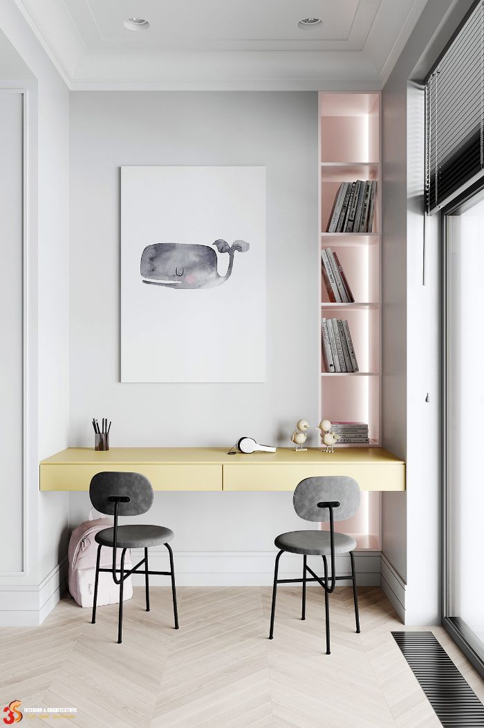 8 | Khu vực học tập cho trẻ em được trang trí bằng màu hồng và màu vàng mềm mại, với hình minh họa cá voi dễ thương trên bức tranh nghệ thuật.