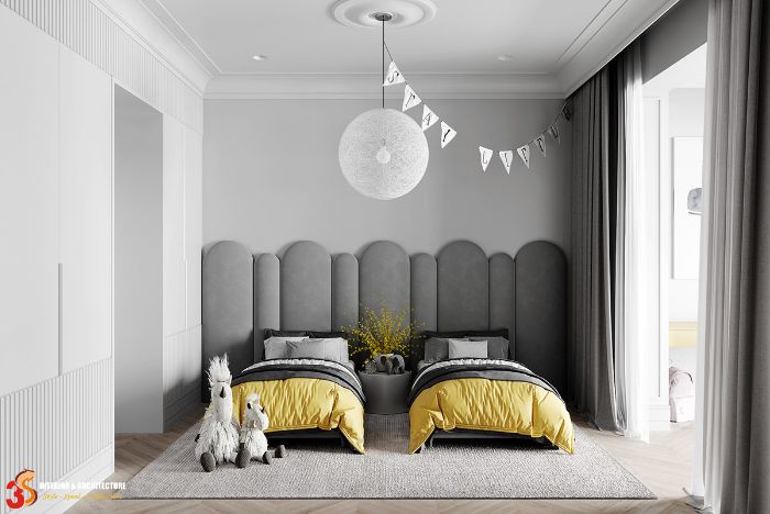 6 | Phòng của những đứa trẻ trong thiết kế nội thất chung cư tân cổ điển có tông màu chủ yếu là màu xám được đan xen bởi các điểm nhấn màu vàng. Những tấm vải treo cờ vui tươi được xâu vào chiếc đèn treo phòng ngủ vô cùng ấn tượng.