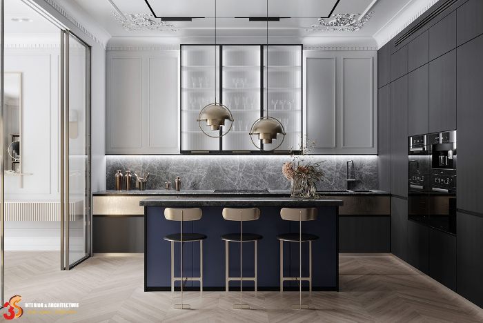 5 | Điểm nhấn cho nhà bếp với nội thất được sử dụng có khung là kim loại đã làm thêm sự tinh tế cho không gian nhà bếp màu gam xanh, trắng và xám.