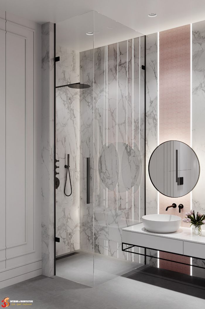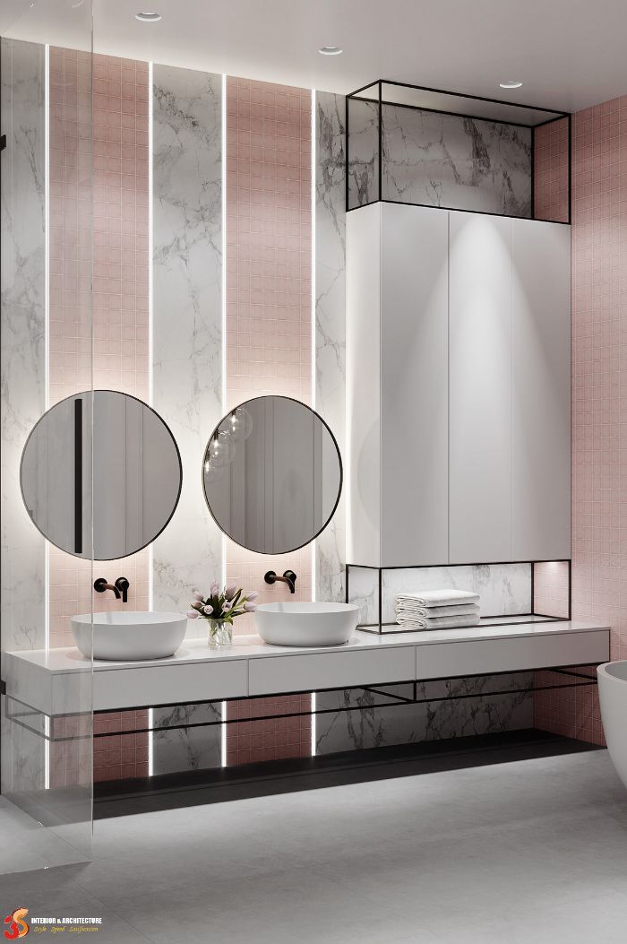 12 | Các dải màu, đá cẩm thạch trắng sang trọng và đèn LED trắng được thiết kế chạy dọc phía sau đôi bồn rửa. Trên đó gắn một cặp gương tròn đầy quyến rũ và mê hoặc.
